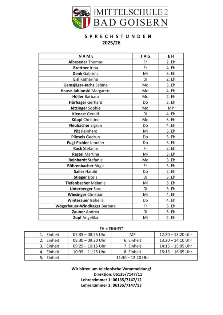Tel.: 06135 71470. E-Mail: s407102@schule-ooe.at . Anschrift: Schmiedgasse 13, 4822 Bad Goisern